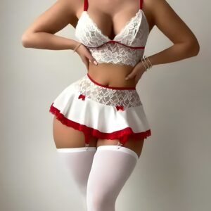Beyaz dantel ve kırmızı detaylı kadın fantazi etekli kostüm, romantik ve şehvetli tasarımıyla dikkat çeker. Üst kısmındaki zarif dantel dokusu, alt kısmındaki mini etek ve kırmızı dantel kenar süslemeleri ile göz alıcı bir uyum sunar. Rahat ve esnek kumaşı sayesinde vücuda mükemmel oturur. Balayı, yıl dönümü ve özel gecelerinizde etkileyici bir stil için idealdir.