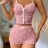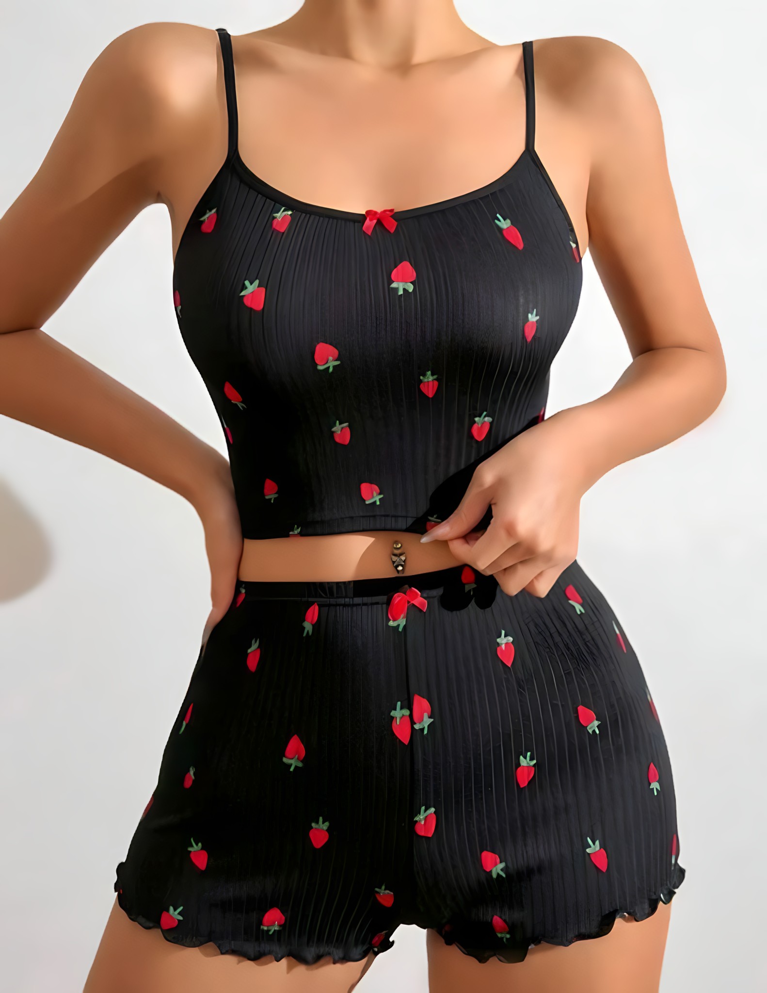 Siyah üzerine kırmızı çilek desenli, askılı crop üst ve şortlu pijama takımı.