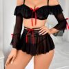 Kadın Siyah Zincir Detaylı Dantel Seksi Gecelik Takım – Jartiyer Askılı İç Giyim Seti
